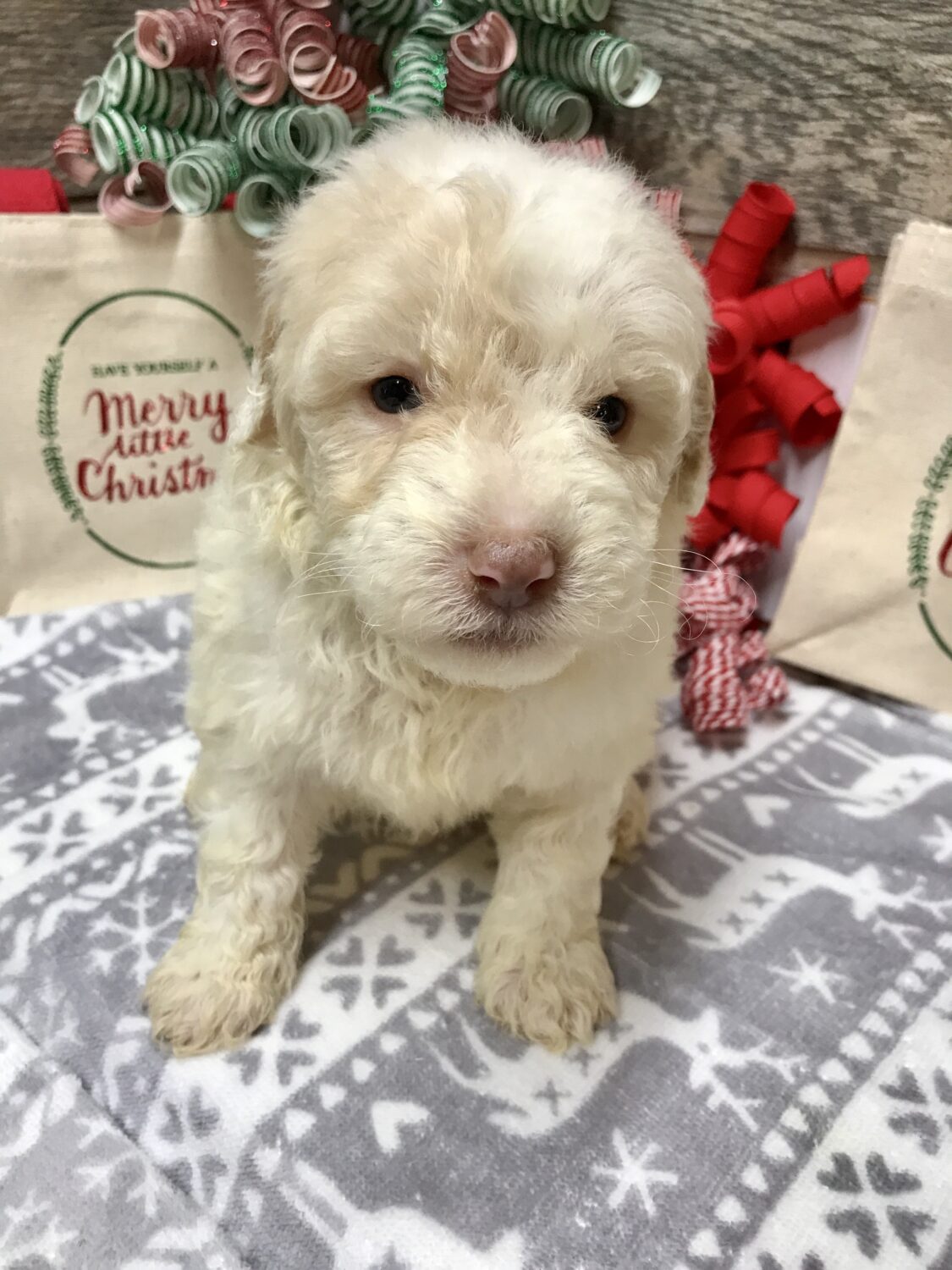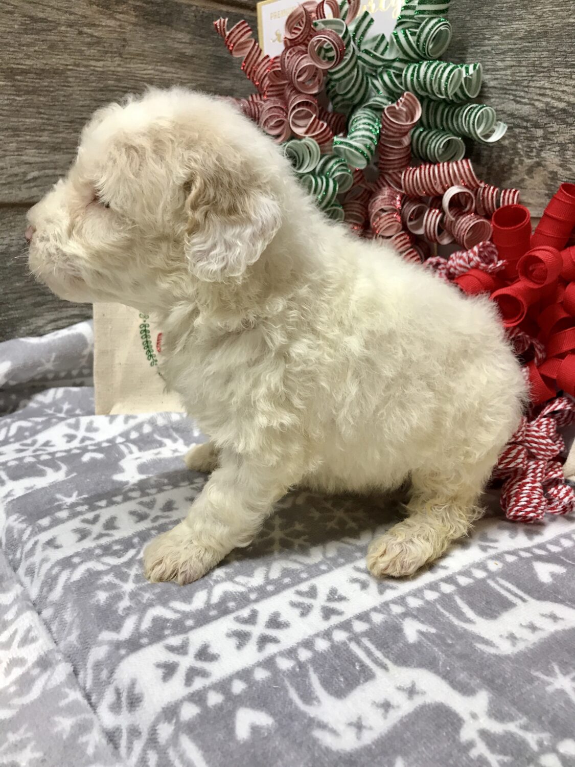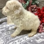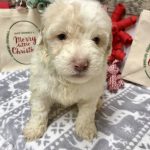 BGCRMPM5 He is a little cream cycle, so cute you could just eat him right up. He is a Parti color, his colors will be more defined as he matures. We expect this multigen litter to mature between 15 to 17 inches weighing 20 to 30 pounds, our best guess! Both parents have non-shedding hair coats, excellent temperaments, awesome personalities…these puppies will be the cream of the crop!