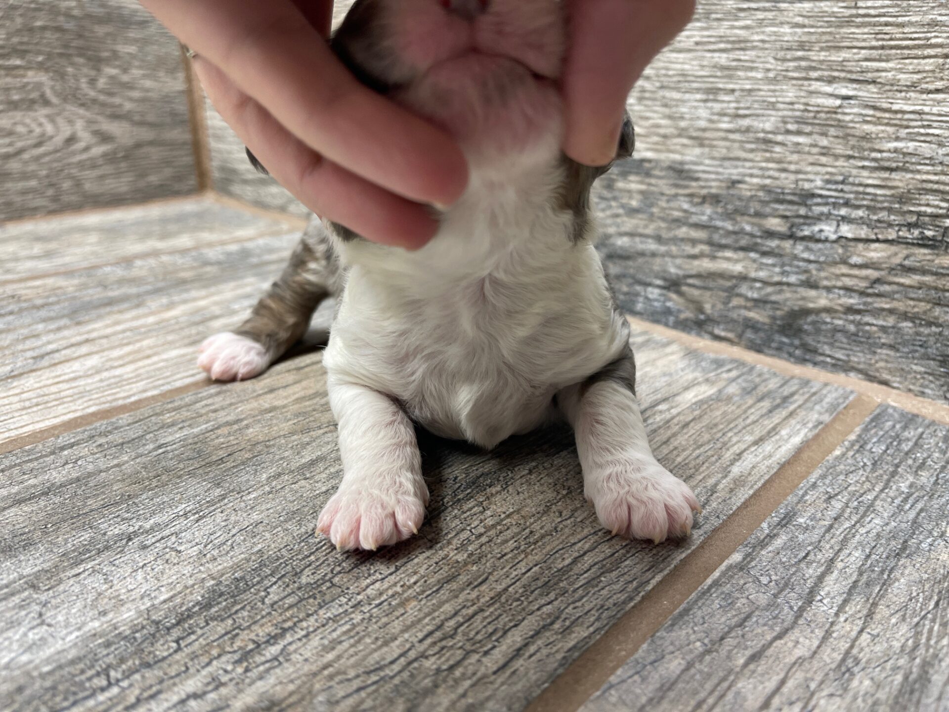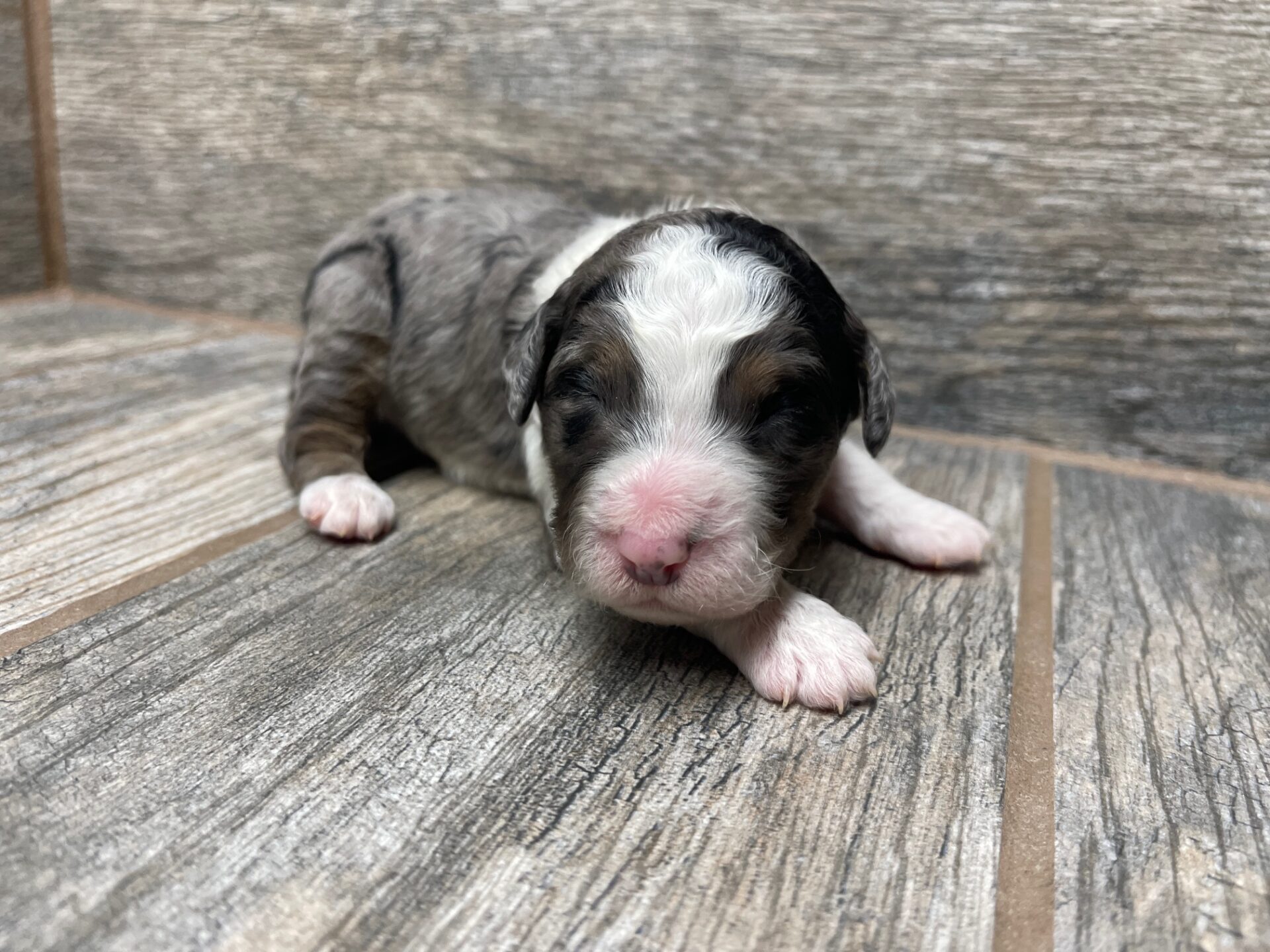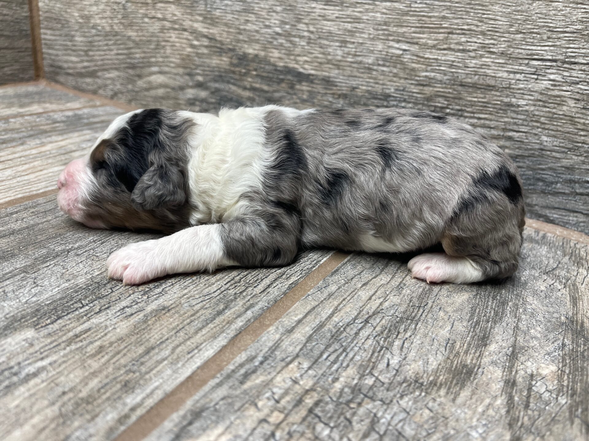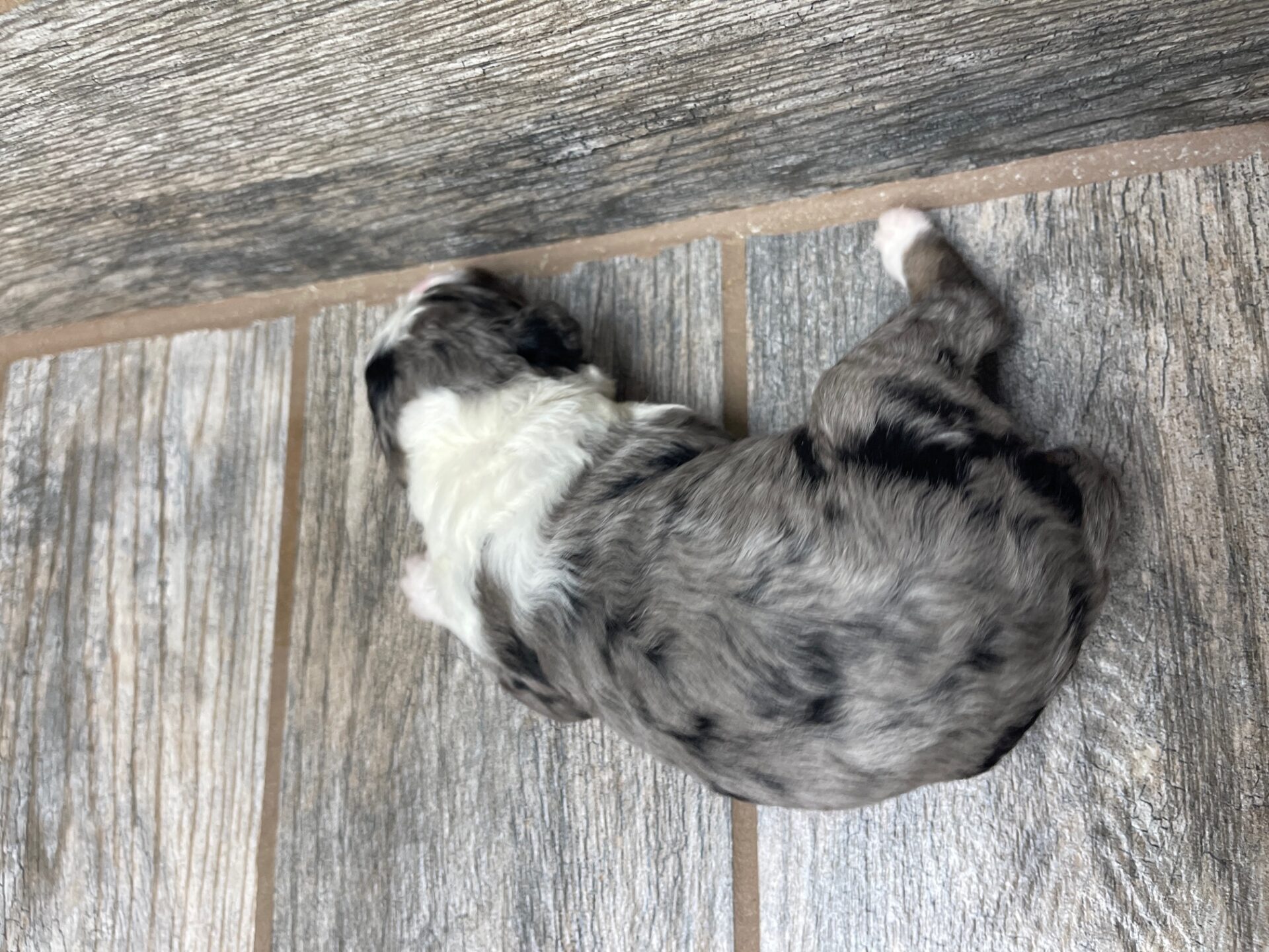 CTBLUMM3- Whoa talk about perfect! Blue merle male with copper and all the white trim you could want! These puppies come with a 2 year health guarantee, health record listing vaccines/dewormers, registration papers, and are examined by the vet and issued a health certificate before they leave. These babies are hypoallergenic and little to no shedding. They are bred with wonderful temperaments and are doggy door trained to potty outside so house training is a breeze! My 4 yr old son “helps” and plays with the puppies so they are exposed to children. If you are wanting one of these pups we sometimes make a delivery route to STL or 2 hours from the house depending on customer locations and amount of pups heading that direction so we can set up a meeting route with a small fee if that ends up working for everyone. We offer airline shipping or flight nanny just need to see on quotes and shipping time frame. We are a small family business as well as a state licensed and inspected kennel. Thank you so much for supporting us! Welcome to the Double R Family!