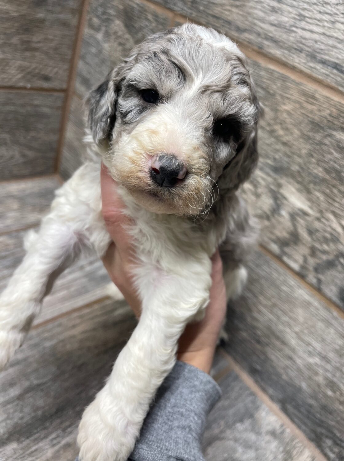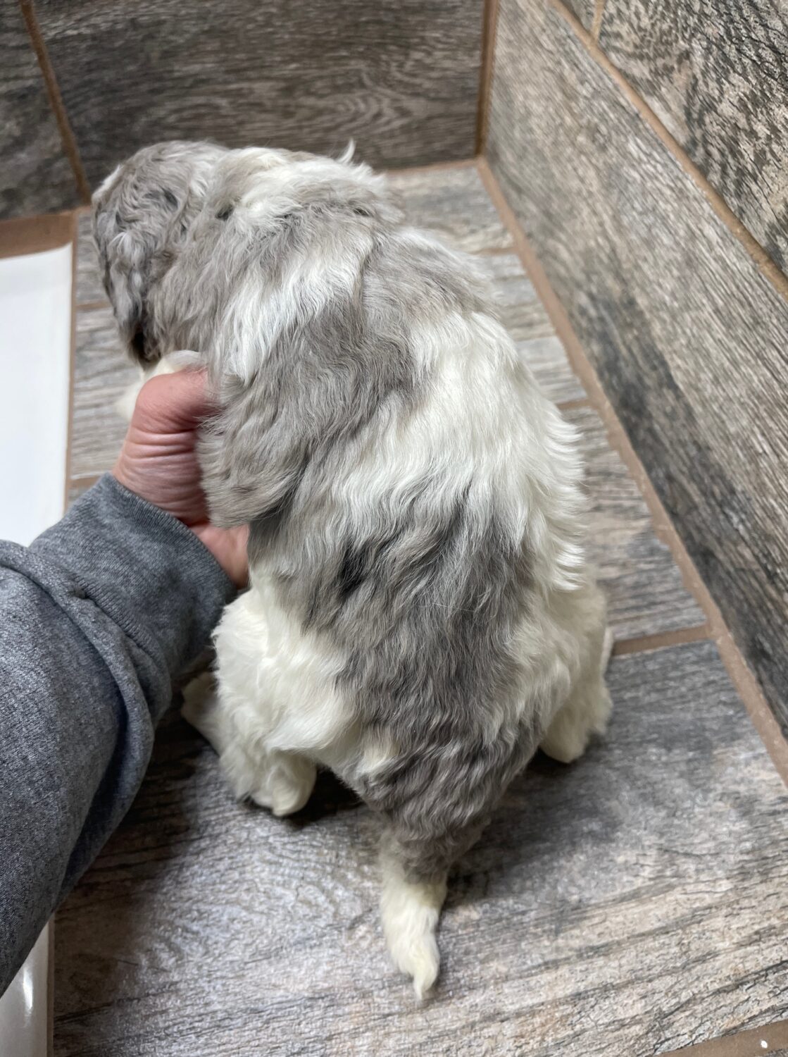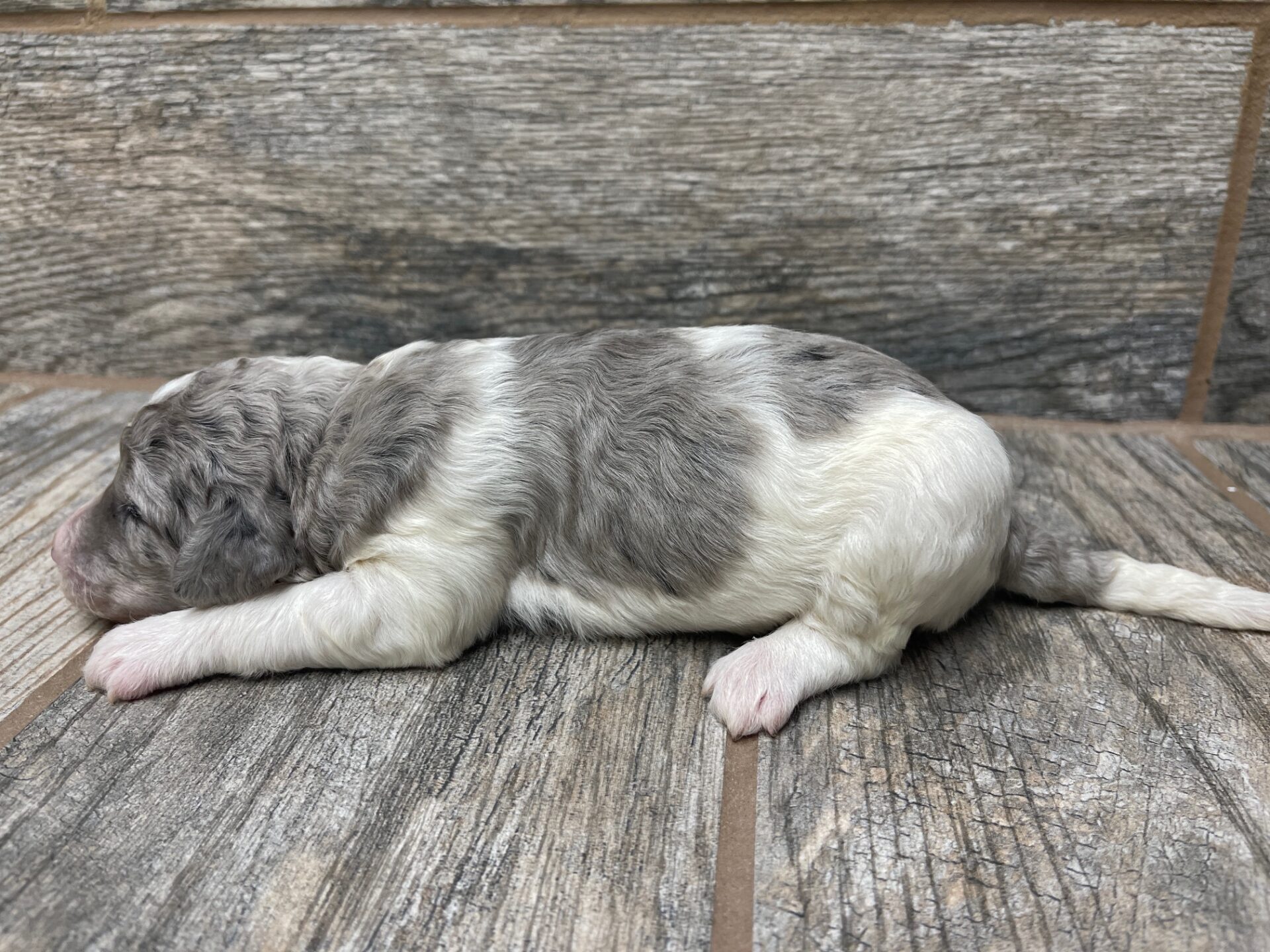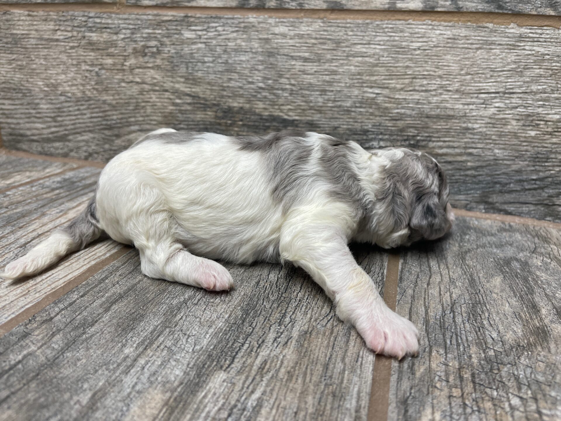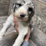 DTBLUMPF2- pretty blue merle parti female! These puppies come with a 2 year health guarantee, health record listing vaccines/dewormers, and are examined by the vet and issued a health certificate before they leave. These babies are hypoallergenic and little to no shedding. They are bred with wonderful temperaments and are doggy door trained to potty outside so house training is a breeze! My 4 yr old son “helps” and plays with the puppies so they are exposed to children. If you are wanting one of these pups we sometimes make a delivery route to STL or 2 hours from the house depending on customer locations and amount of pups heading that direction so we can set up a meeting route with a small fee if that ends up working for everyone. We offer airline shipping or flight nanny just need to see on quotes and shipping time frame. We are a small family business as well as a state licensed and inspected kennel. Thank you so much for supporting us! Welcome to the Double R Family!
