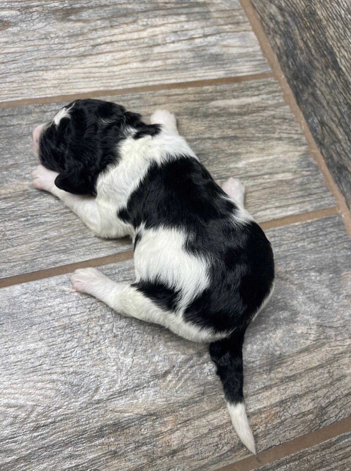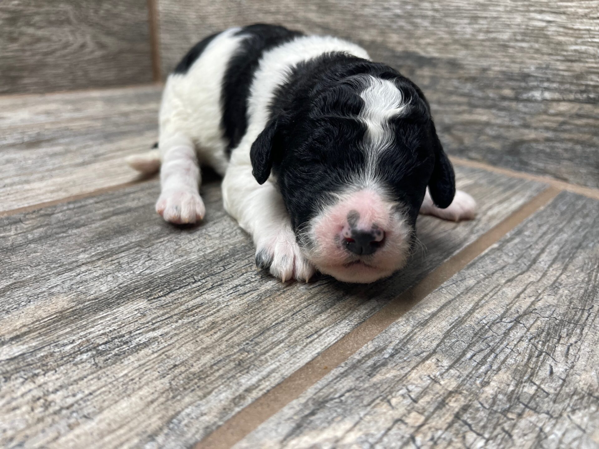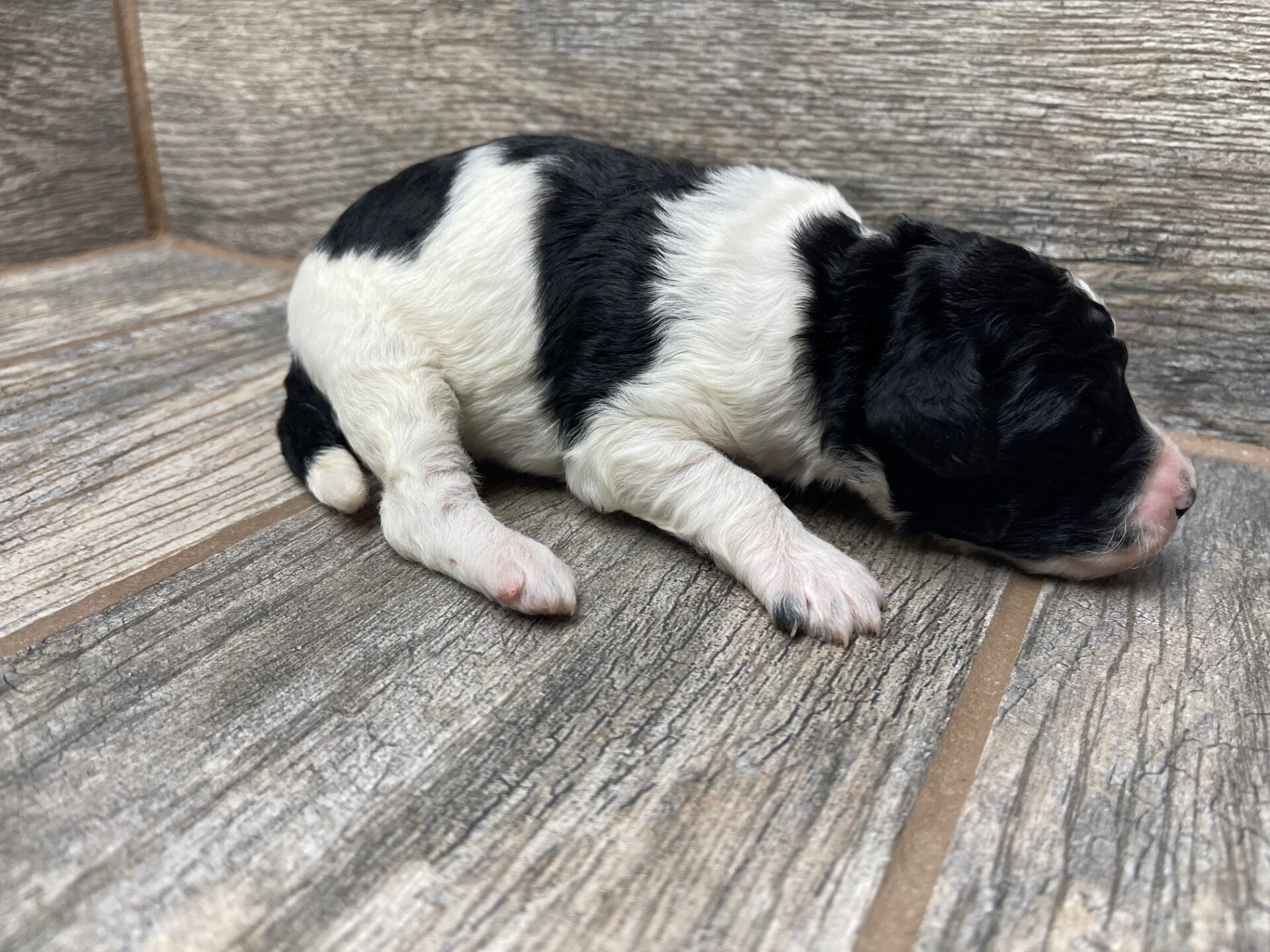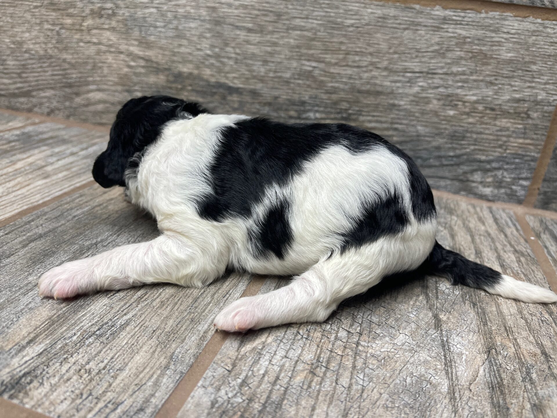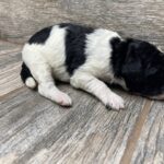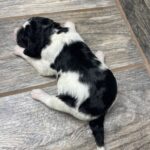 DTBLKWPF1- cute little black and white parti female! These puppies come with a 2 year health guarantee, health record listing vaccines/dewormers, and are examined by the vet and issued a health certificate before they leave. These babies are hypoallergenic and little to no shedding. They are bred with wonderful temperaments and are doggy door trained to potty outside so house training is a breeze! My 4 yr old son “helps” and plays with the puppies so they are exposed to children. If you are wanting one of these pups we sometimes make a delivery route to STL or 2 hours from the house depending on customer locations and amount of pups heading that direction so we can set up a meeting route with a small fee if that ends up working for everyone. We offer airline shipping or flight nanny just need to see on quotes and shipping time frame. We are a small family business as well as a state licensed and inspected kennel. Thank you so much for supporting us! Welcome to the Double R Family!