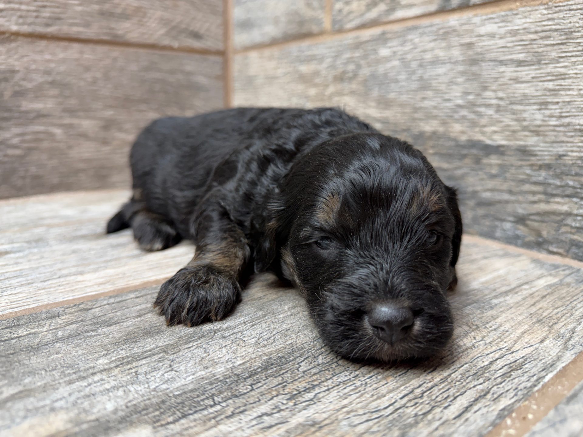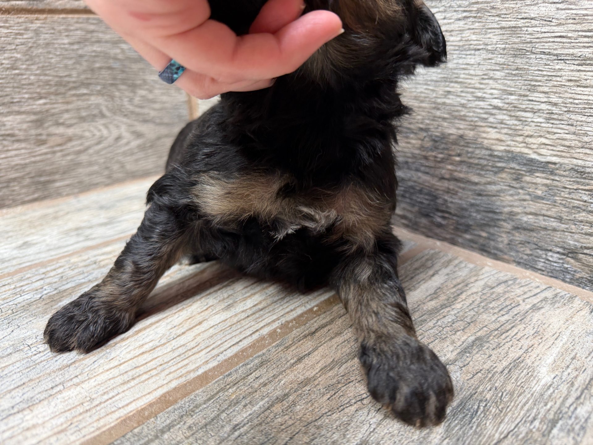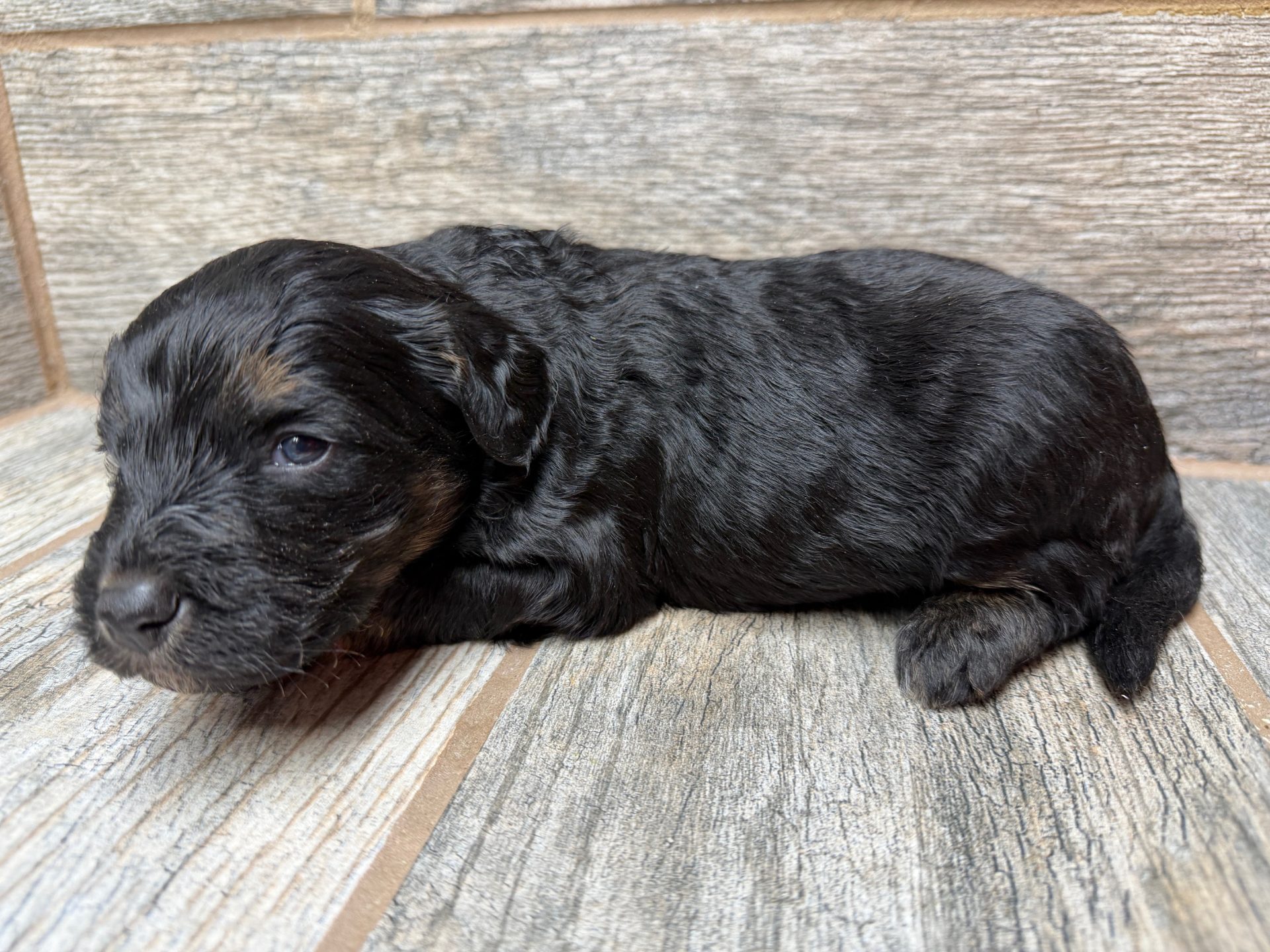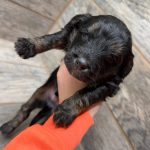 JTBLKTRIM8- check out the copper on this handsome black tri male! These puppies come with a 2 year health guarantee, health record listing vaccines/dewormers, and are examined by the vet and issued a health certificate before they leave. These babies are hypoallergenic and little to no shedding. They are bred with wonderful temperaments and are doggy door trained to potty outside so house training is a breeze! My 5 yr old son “helps” and plays with the puppies so they are exposed to children. If you are wanting one of these pups we sometimes make a delivery route to STL or 2 hours from the house depending on customer locations and amount of pups heading that direction so we can set up a meeting route with a small fee if that ends up working for everyone. We offer airline shipping or flight nanny just need to see on quotes and shipping time frame. We are a small family business as well as a state licensed and inspected kennel. Thank you so much for supporting us! Welcome to the Double R Family!