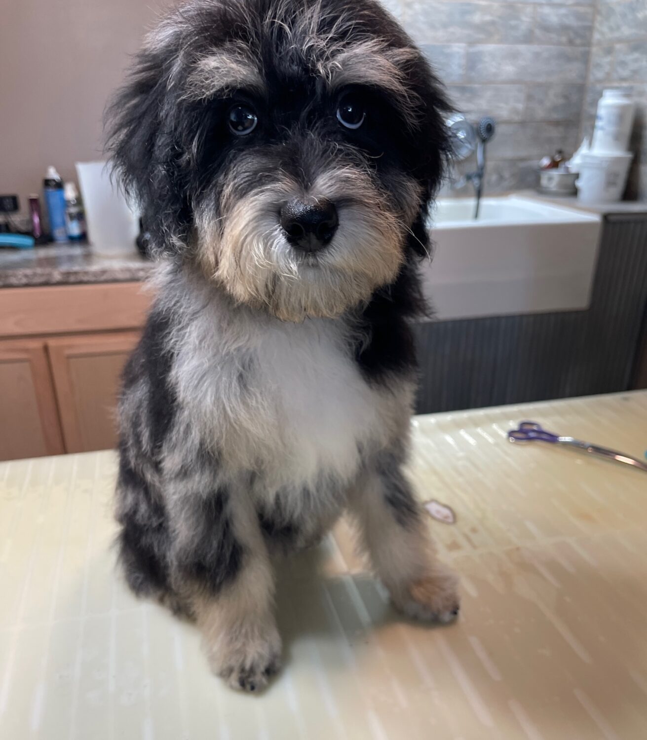 MSBLUMF8- Gorgeous blue merle female with copper! She has been bathed, fluffed and lightly trimmed. She was perfect for being groomed! These puppies come with a 2 year health guarantee, health record listing vaccines/dewormers, registration papers, and are examined by the vet and issued a health certificate before they leave. These babies are hypoallergenic and little to no shedding. They are bred with wonderful temperaments and are doggy door trained to potty outside so house training is a breeze! My 4 yr old son “helps” and plays with the puppies so they are exposed to children. If you are wanting one of these pups we sometimes make a delivery route to STL or 2 hours from the house depending on customer locations and amount of pups heading that direction so we can set up a meeting route with a small fee if that ends up working for everyone. We offer airline shipping or flight nanny just need to see on quotes and shipping time frame. We are a small family business as well as a state licensed and inspected kennel. Thank you so much for supporting us! Welcome to the Double R Family!