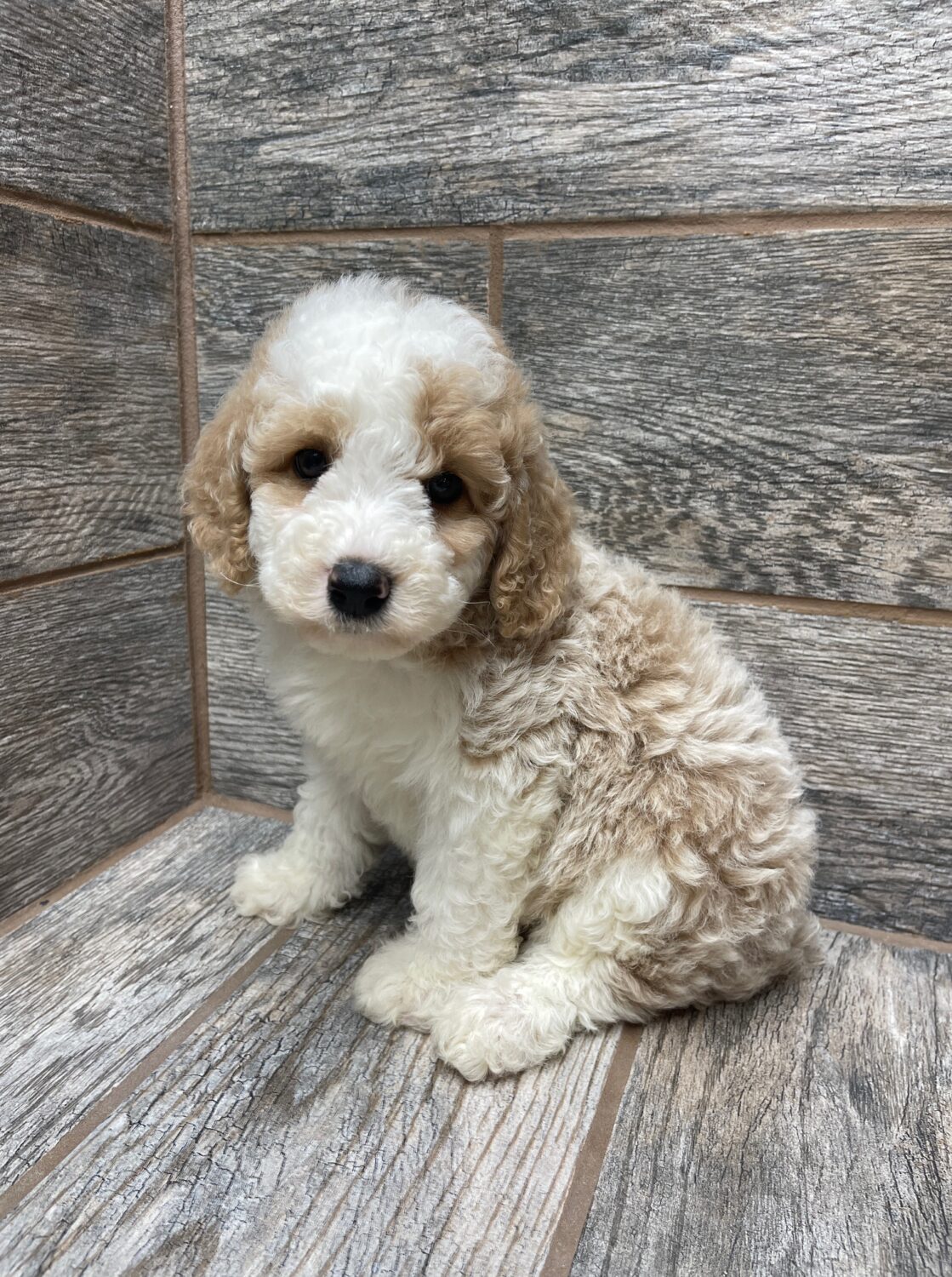 PNCRMWF6- she is a beautiful cream and white tuxedo! These puppies come with a 2 year health guarantee, health record listing vaccines/dewormers, registration papers, and are examined by the vet and issued a health certificate before they leave. These babies are hypoallergenic and little to no shedding. They are bred with wonderful temperaments and are doggy door trained to potty outside so house training is a breeze! My 4 yr old son “helps” and plays with the puppies so they are exposed to children. If you are wanting one of these pups we sometimes make a delivery route to STL or 2 hours from the house depending on customer locations and amount of pups heading that direction so we can set up a meeting route with a small fee if that ends up working for everyone. We offer airline shipping or flight nanny just need to see on quotes and shipping time frame. We are a small family business as well as a state licensed and inspected kennel. Thank you so much for supporting us! Welcome to the Double R Family!