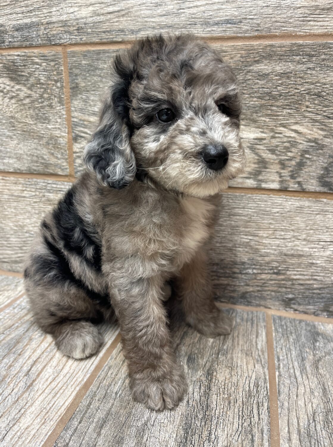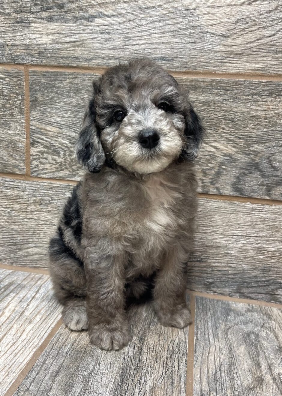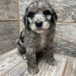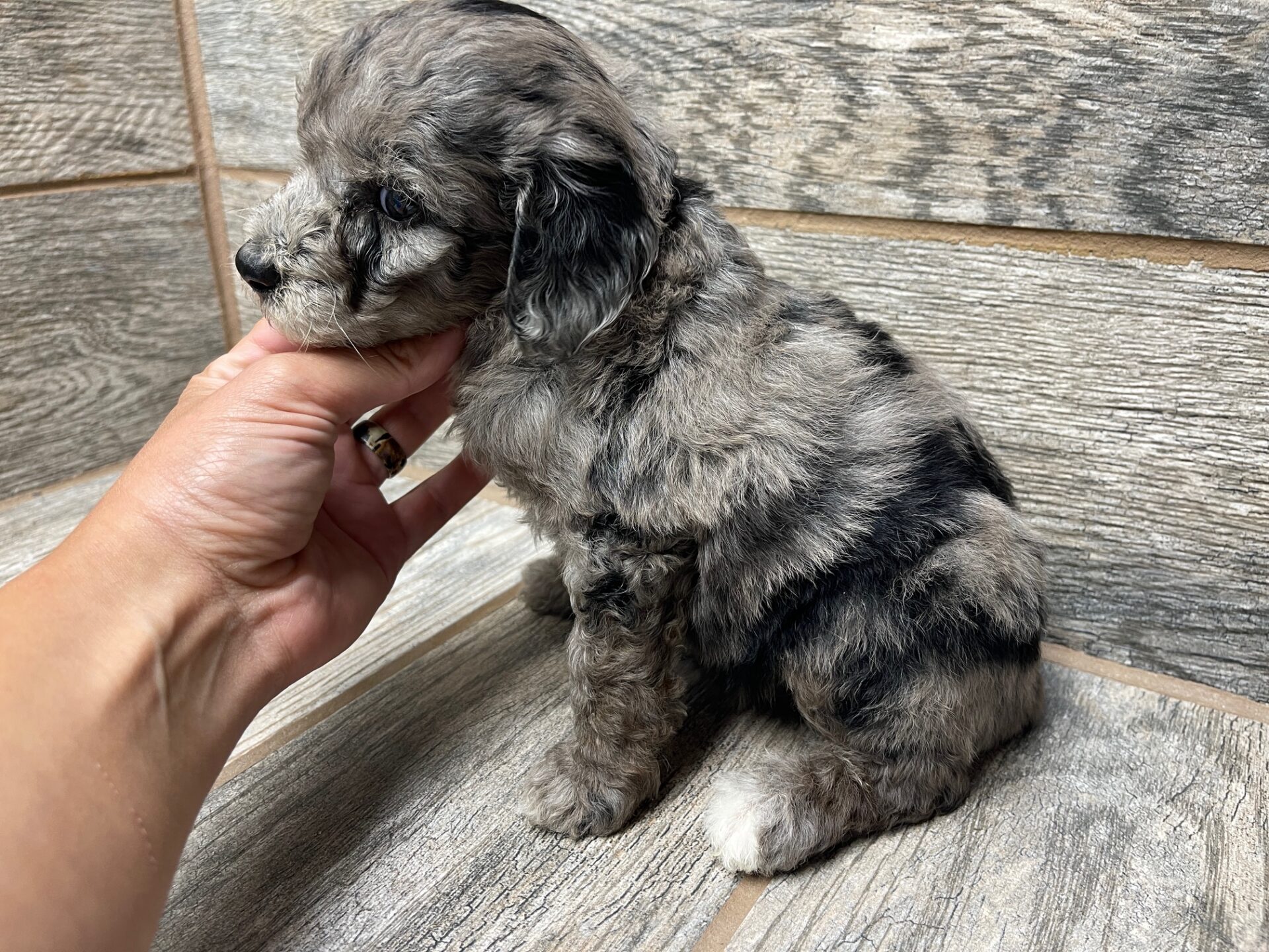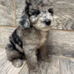 PNBLUMF3- goregous blue merle female with copper! These puppies come with a 2 year health guarantee, health record listing vaccines/dewormers, registration papers, and are examined by the vet and issued a health certificate before they leave. These babies are hypoallergenic and little to no shedding. They are bred with wonderful temperaments and are doggy door trained to potty outside so house training is a breeze! My 4 yr old son “helps” and plays with the puppies so they are exposed to children. If you are wanting one of these pups we sometimes make a delivery route to STL or 2 hours from the house depending on customer locations and amount of pups heading that direction so we can set up a meeting route with a small fee if that ends up working for everyone. We offer airline shipping or flight nanny just need to see on quotes and shipping time frame. We are a small family business as well as a state licensed and inspected kennel. Thank you so much for supporting us! Welcome to the Double R Family!