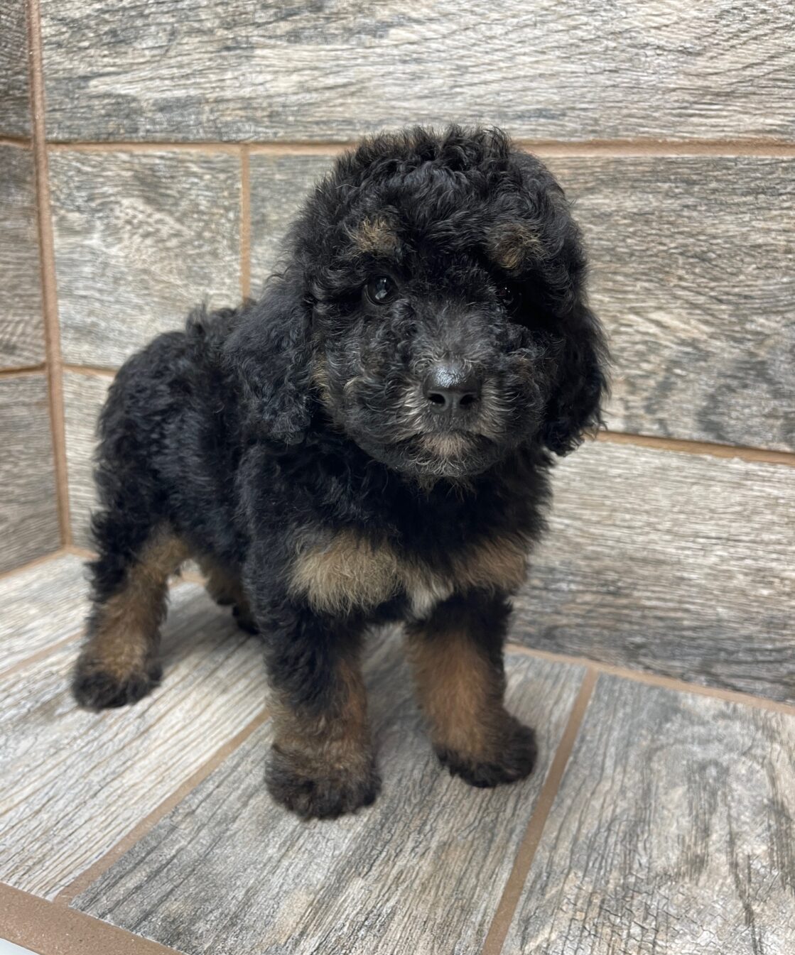 PNBLKTRIM1- handsome black tri male with vibrant copper! These puppies come with a 2 year health guarantee, health record listing vaccines/dewormers, registration papers, and are examined by the vet and issued a health certificate before they leave. These babies are hypoallergenic and little to no shedding. They are bred with wonderful temperaments and are doggy door trained to potty outside so house training is a breeze! My 4 yr old son “helps” and plays with the puppies so they are exposed to children. If you are wanting one of these pups we sometimes make a delivery route to STL or 2 hours from the house depending on customer locations and amount of pups heading that direction so we can set up a meeting route with a small fee if that ends up working for everyone. We offer airline shipping or flight nanny just need to see on quotes and shipping time frame. We are a small family business as well as a state licensed and inspected kennel. Thank you so much for supporting us! Welcome to the Double R Family!