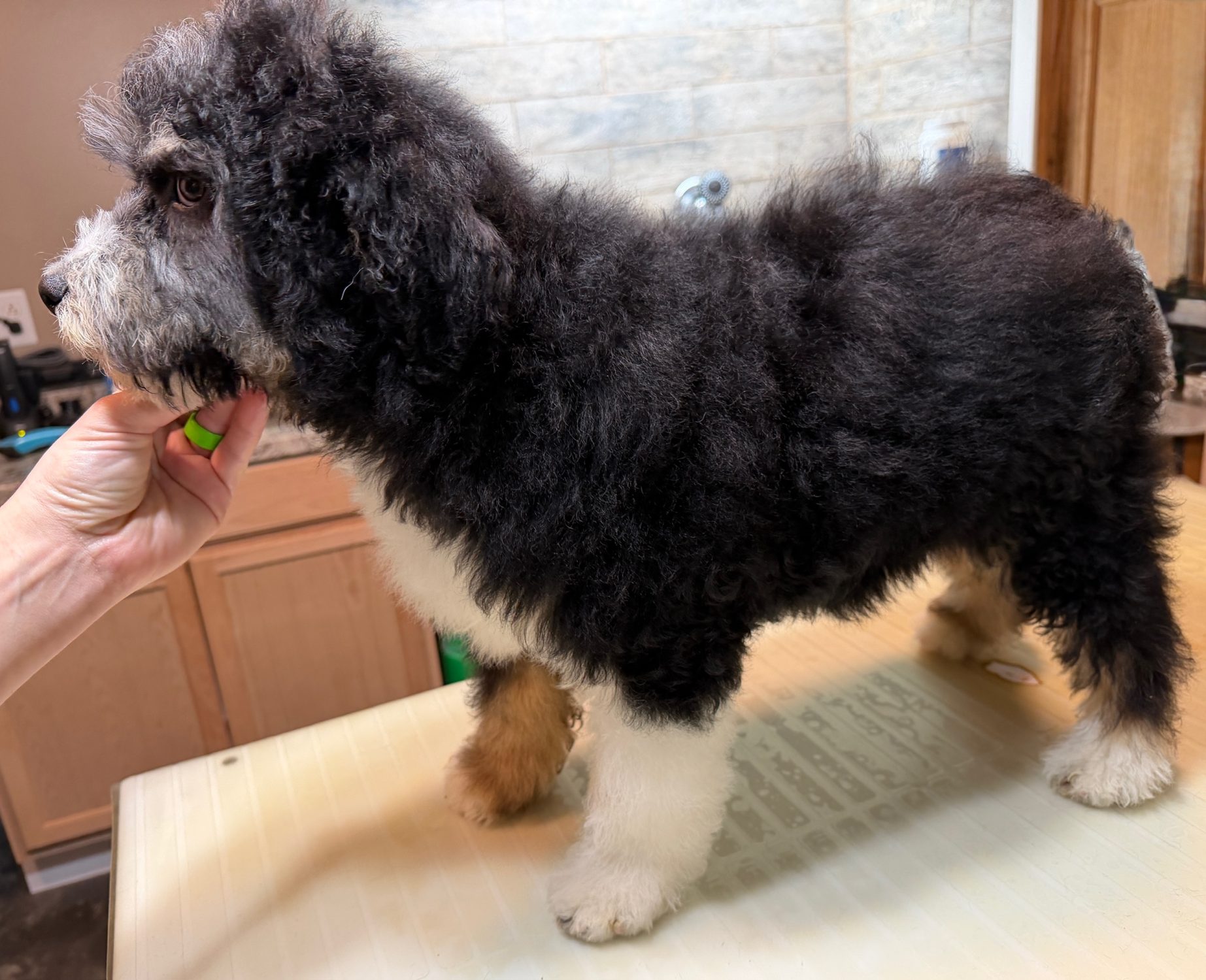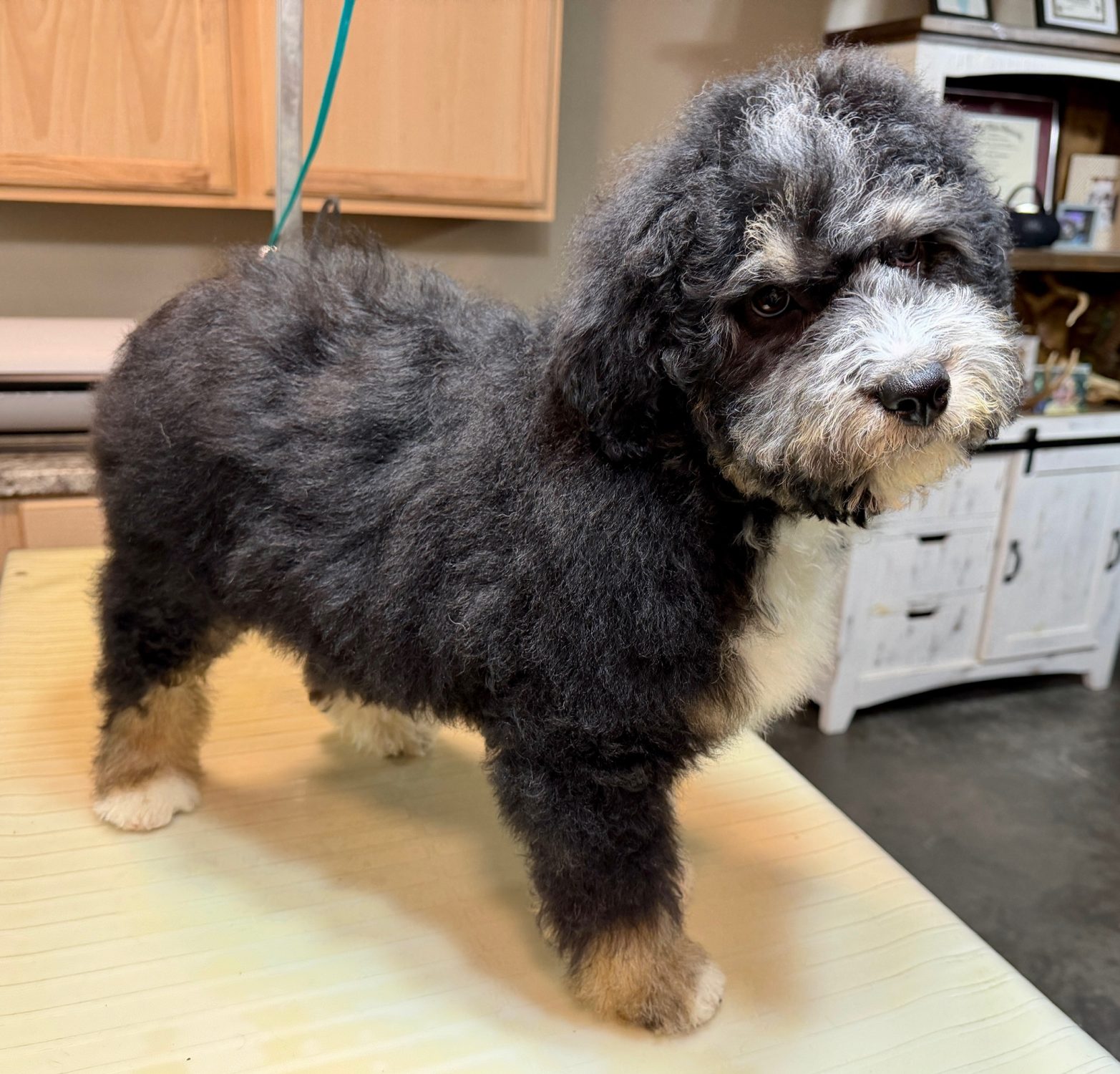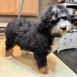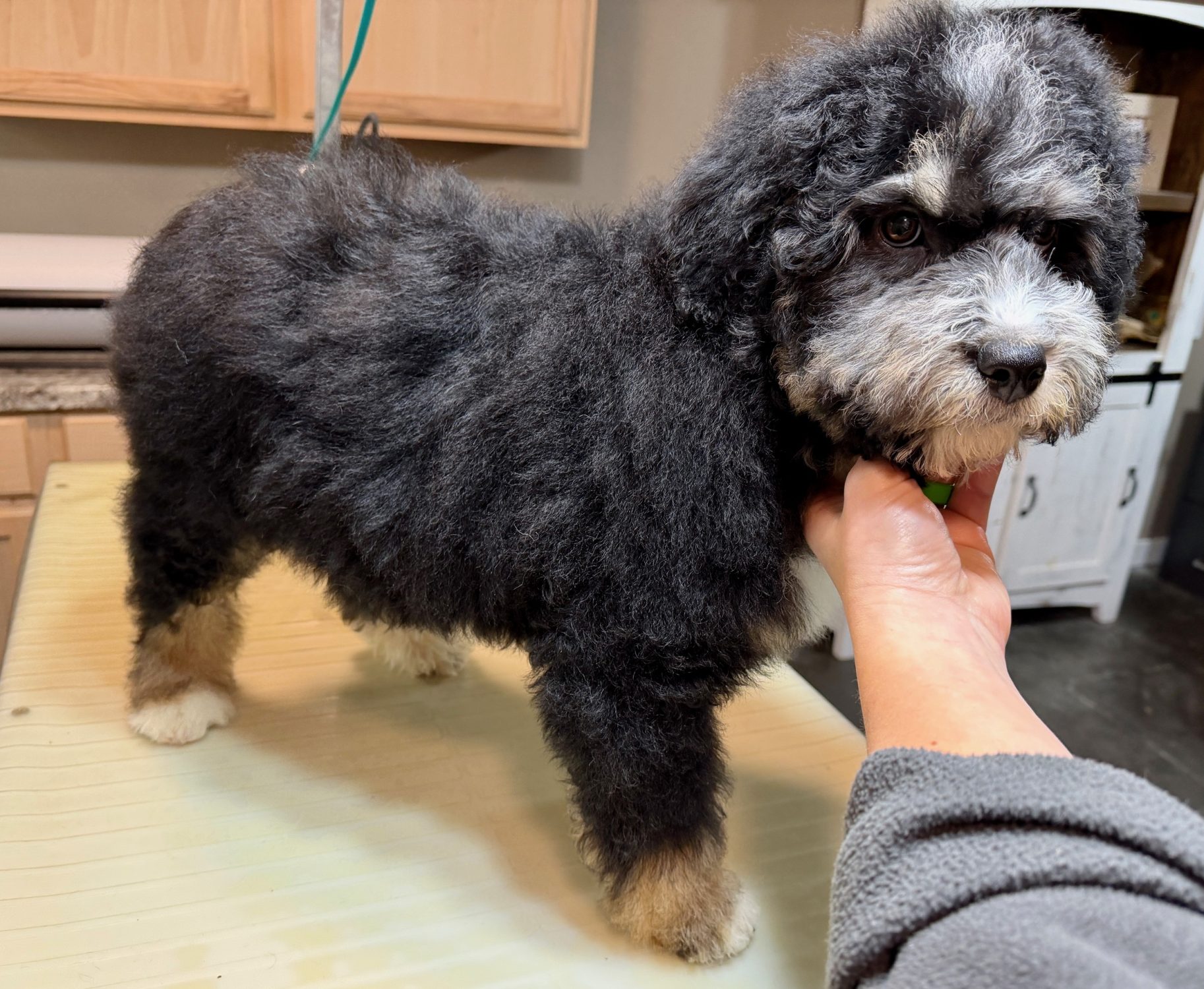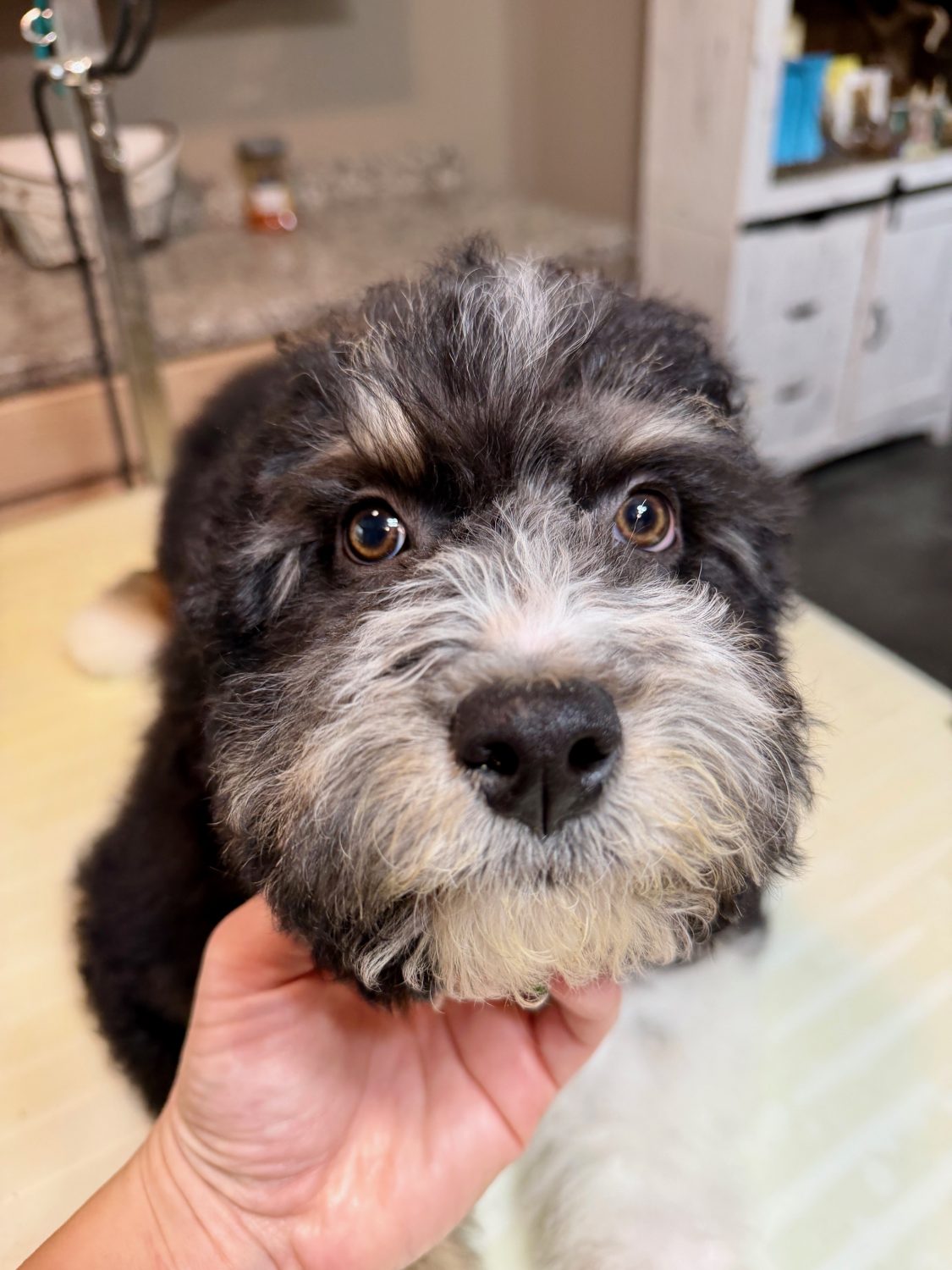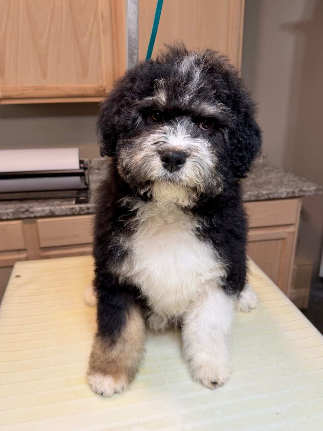 RSBLKTRIM3- more eyebrows! This handsome black tri male has bright copper and a sweet face. These puppies come with a 2 year health guarantee, health record listing vaccines/dewormers, registration papers, and are examined by the vet and issued a health certificate before they leave. These babies are hypoallergenic and little to no shedding. They are bred with wonderful temperaments and are doggy door trained to potty outside so house training is a breeze! My 4 yr old son “helps” and plays with the puppies so they are exposed to children. If you are wanting one of these pups we sometimes make a delivery route to STL or 2 hours from the house depending on customer locations and amount of pups heading that direction so we can set up a meeting route with a small fee if that ends up working for everyone. We offer airline shipping or flight nanny just need to see on quotes and shipping time frame. We are a small family business as well as a state licensed and inspected kennel. Thank you so much for supporting us! Welcome to the Double R Family!