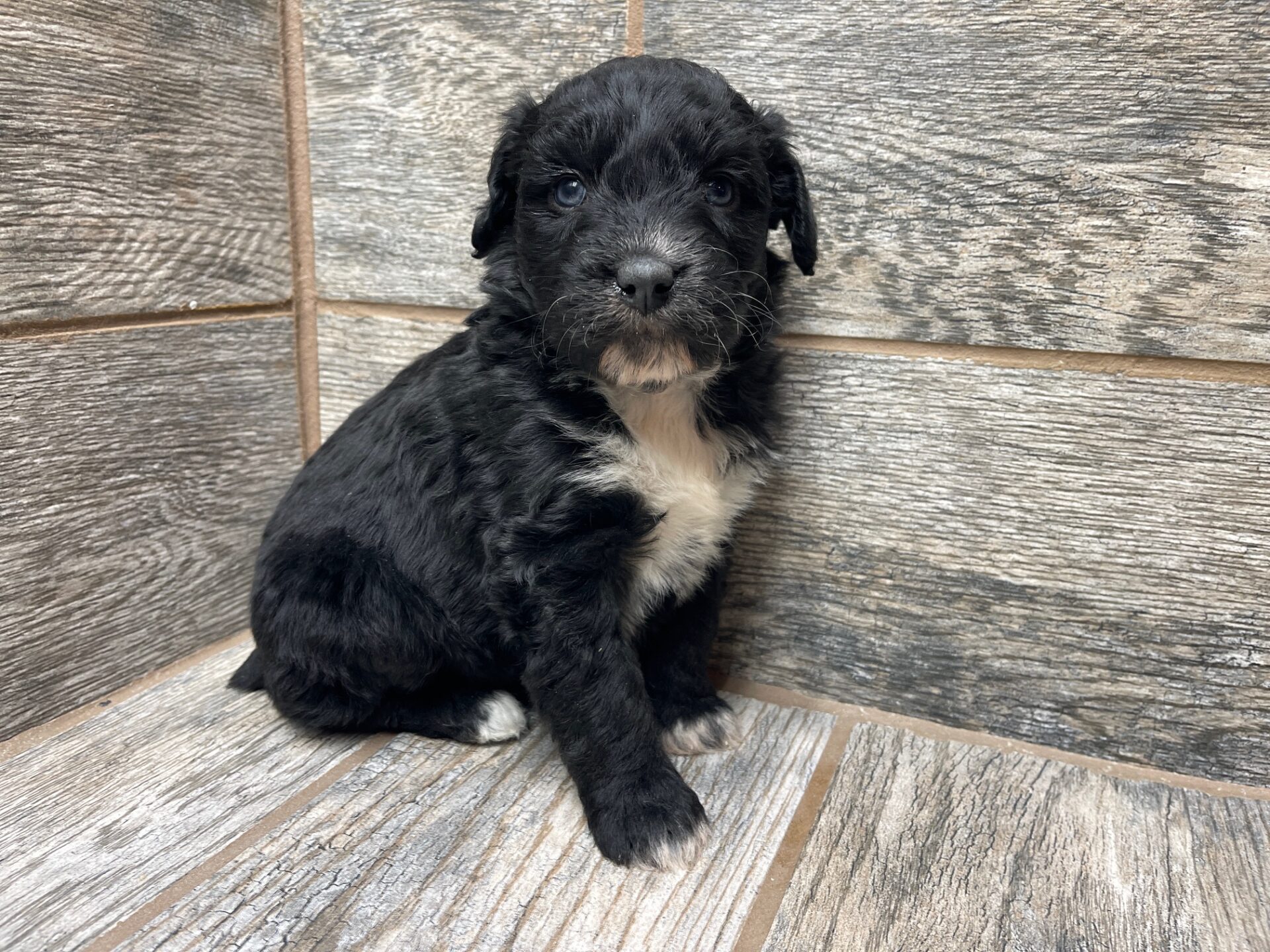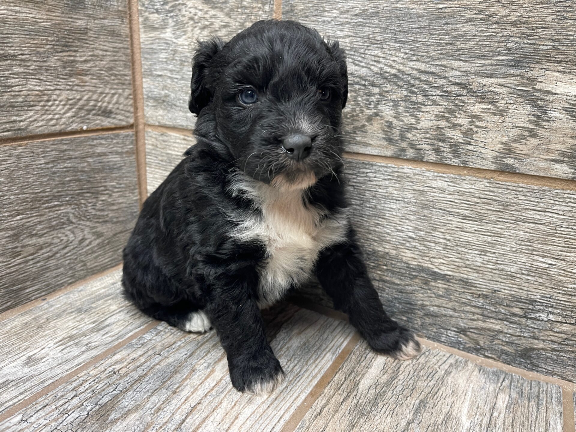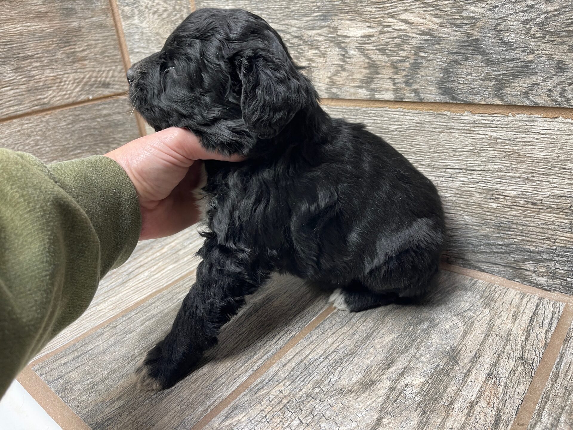 RSBLKTRIF1- sweet black tri female. She has very light copper but it will be more vibrant as she matures! These puppies come with a 2 year health guarantee, health record listing vaccines/dewormers, registration papers, and are examined by the vet and issued a health certificate before they leave. These babies are hypoallergenic and little to no shedding. They are bred with wonderful temperaments and are doggy door trained to potty outside so house training is a breeze! My 4 yr old son “helps” and plays with the puppies so they are exposed to children. If you are wanting one of these pups we sometimes make a delivery route to STL or 2 hours from the house depending on customer locations and amount of pups heading that direction so we can set up a meeting route with a small fee if that ends up working for everyone. We offer airline shipping or flight nanny just need to see on quotes and shipping time frame. We are a small family business as well as a state licensed and inspected kennel. Thank you so much for supporting us! Welcome to the Double R Family!