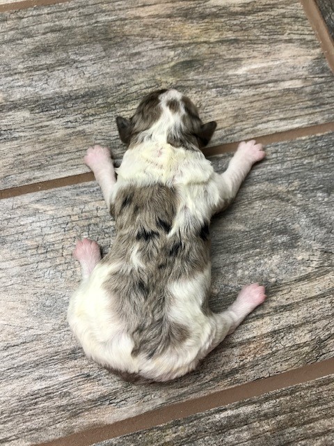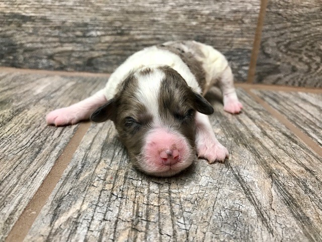 RGBLUMPM4 Bold and beautiful is how to describe this handsome blue merle Parti male. He has enough merle markings to make him stand out. It’s entirely possible he could have blue eyes! We expect this litter to mature between 15 to 17 inches, weighing 20 to 30 pounds. Both Remme and Gator have wonderful laid back personalities, with gentle natures…these puppies will be AWESOME!