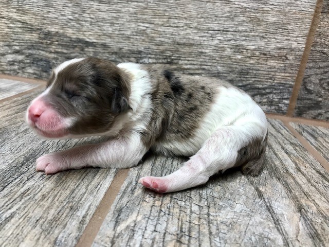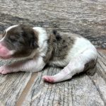 RGBLUMPF1 Charming and disarming is how to describe this little beauty. She is a blue merle Parti with nice markings, plenty of color, the possibility of blue eyes! We expect this litter to mature between 15 to 17 inches, weighing 20 to 30 pounds. Both Remme and Gator have wonderful laid back personalities, with gentle natures…these puppies will be AWESOME!