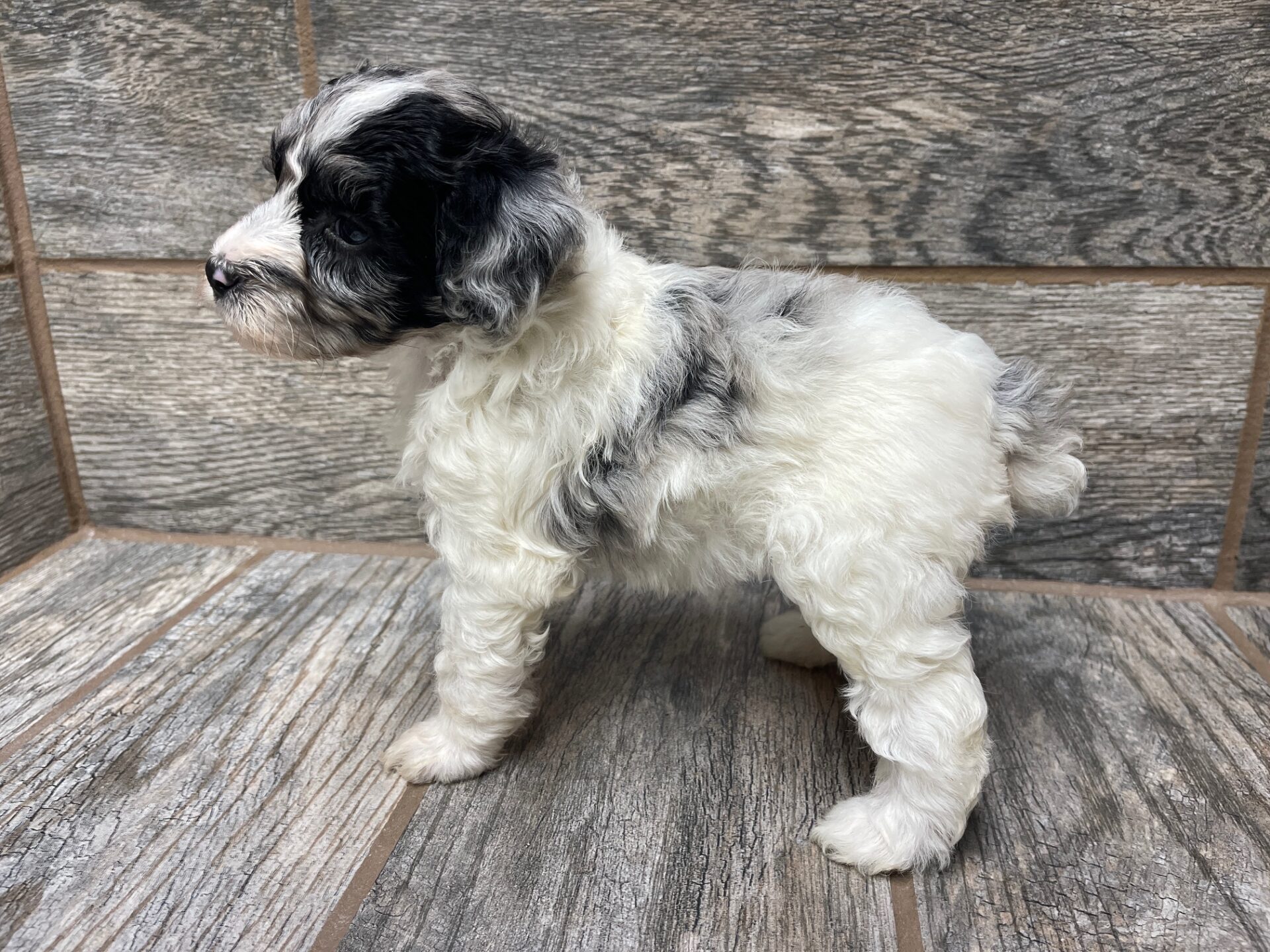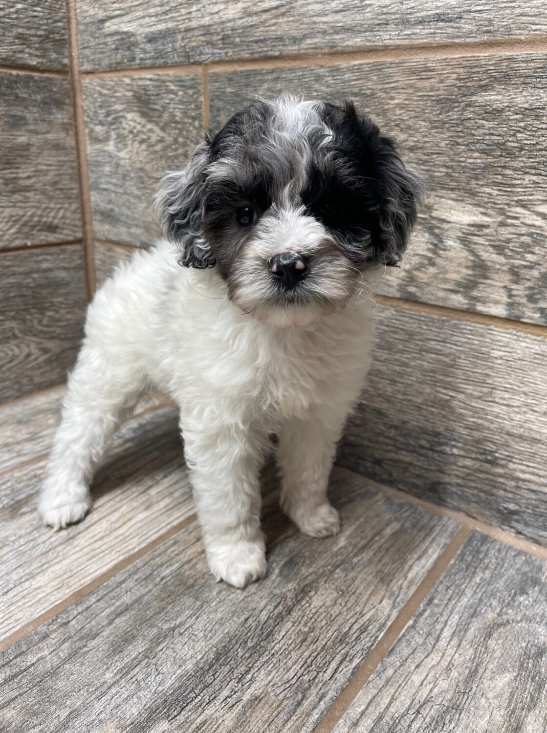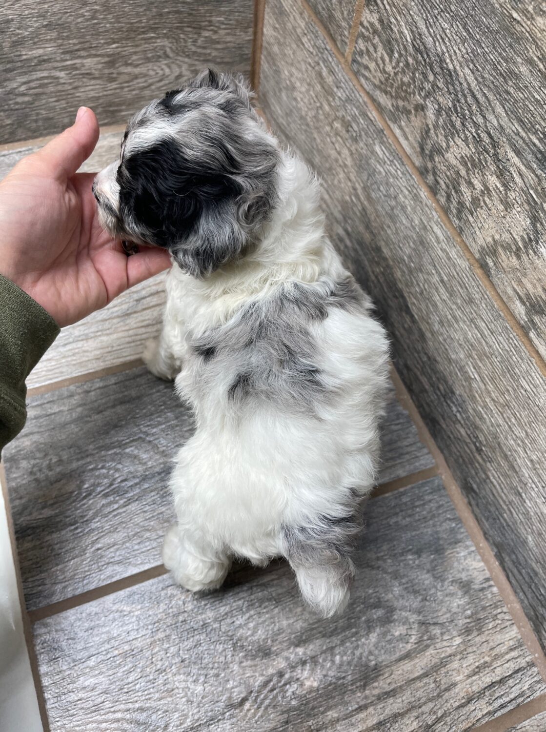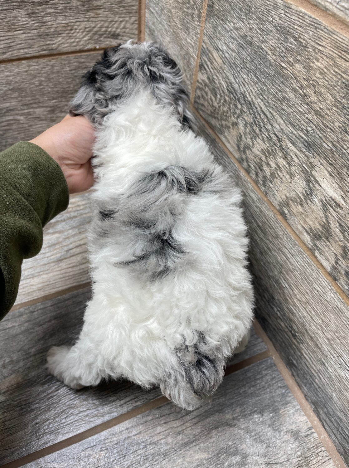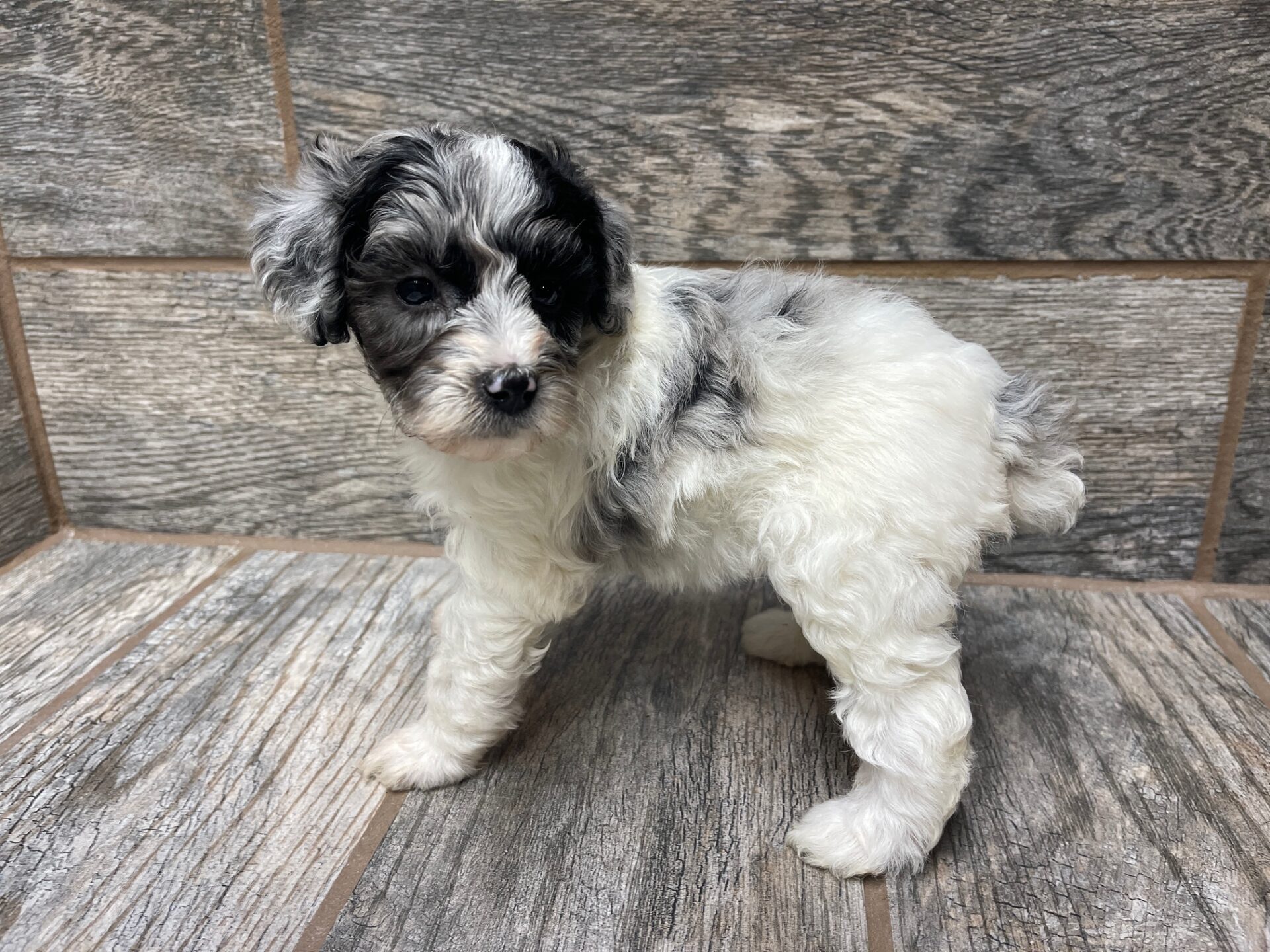 SMBLUMPF1- Sweet little blue merle parti female! These puppies come with a 2 year health guarantee, health record listing vaccines/dewormers, registration papers, and are examined by the vet and issued a health certificate before they leave. These babies are hypoallergenic and little to no shedding. They are bred with wonderful temperaments and are doggy door trained to potty outside so house training is a breeze! My 4 yr old son “helps” and plays with the puppies so they are exposed to children. If you are wanting one of these pups we sometimes make a delivery route to STL or 2 hours from the house depending on customer locations and amount of pups heading that direction so we can set up a meeting route with a small fee if that ends up working for everyone. We offer airline shipping or flight nanny just need to see on quotes and shipping time frame. We are a small family business as well as a state licensed and inspected kennel. Thank you so much for supporting us! Welcome to the Double R Family!